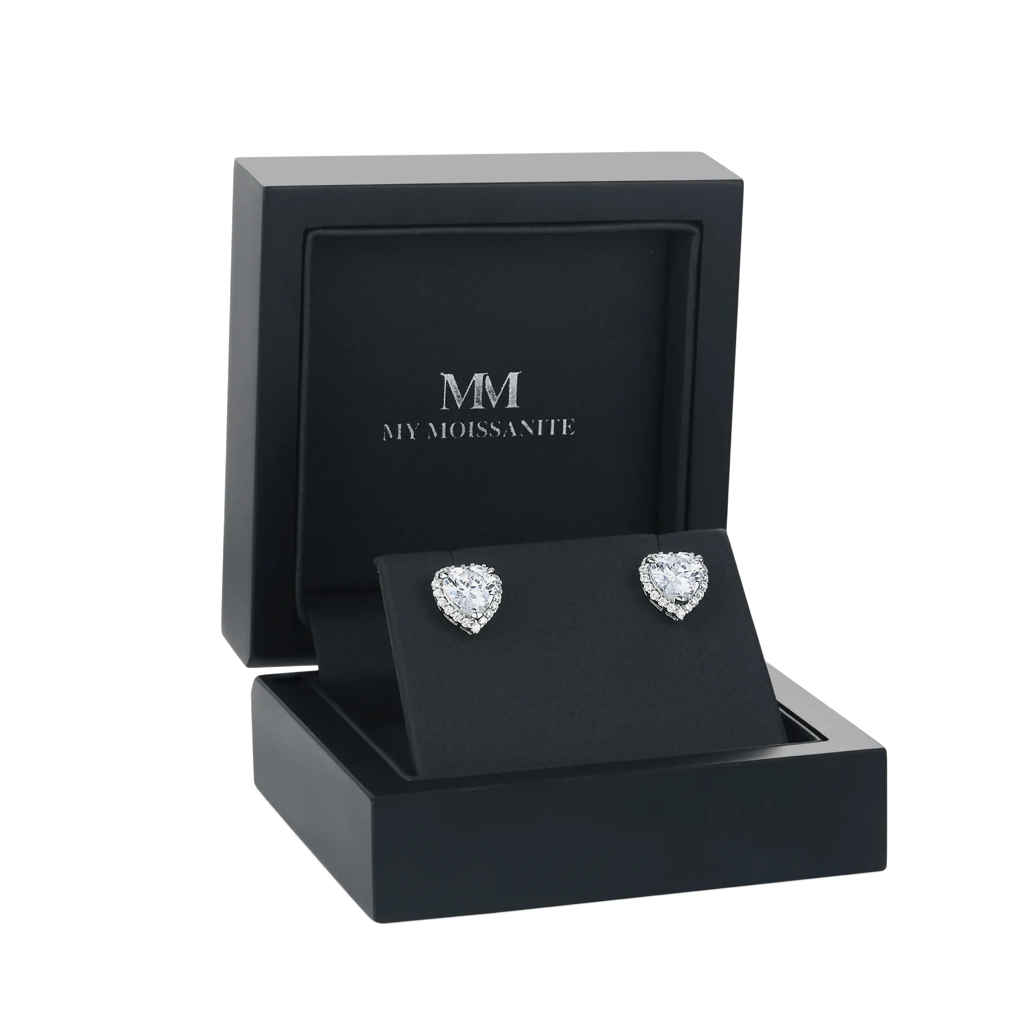 Oczekuj komplementów z tymi unikalnymi kolczykami z moissanitem w kształcie serca. Każdy kolczyk posiada kamień moissanitu w kształcie serca, oprawiony w otokę z kamieni bocznych. O całkowitej masie 2.7 karata, dodają glamour każdemu strojowi. Ich luksusowy i elegancki wygląd komplementuje każdy strój, a do tego są dostarczane w wysokiej jakości drewnianym pudełku na prezent.