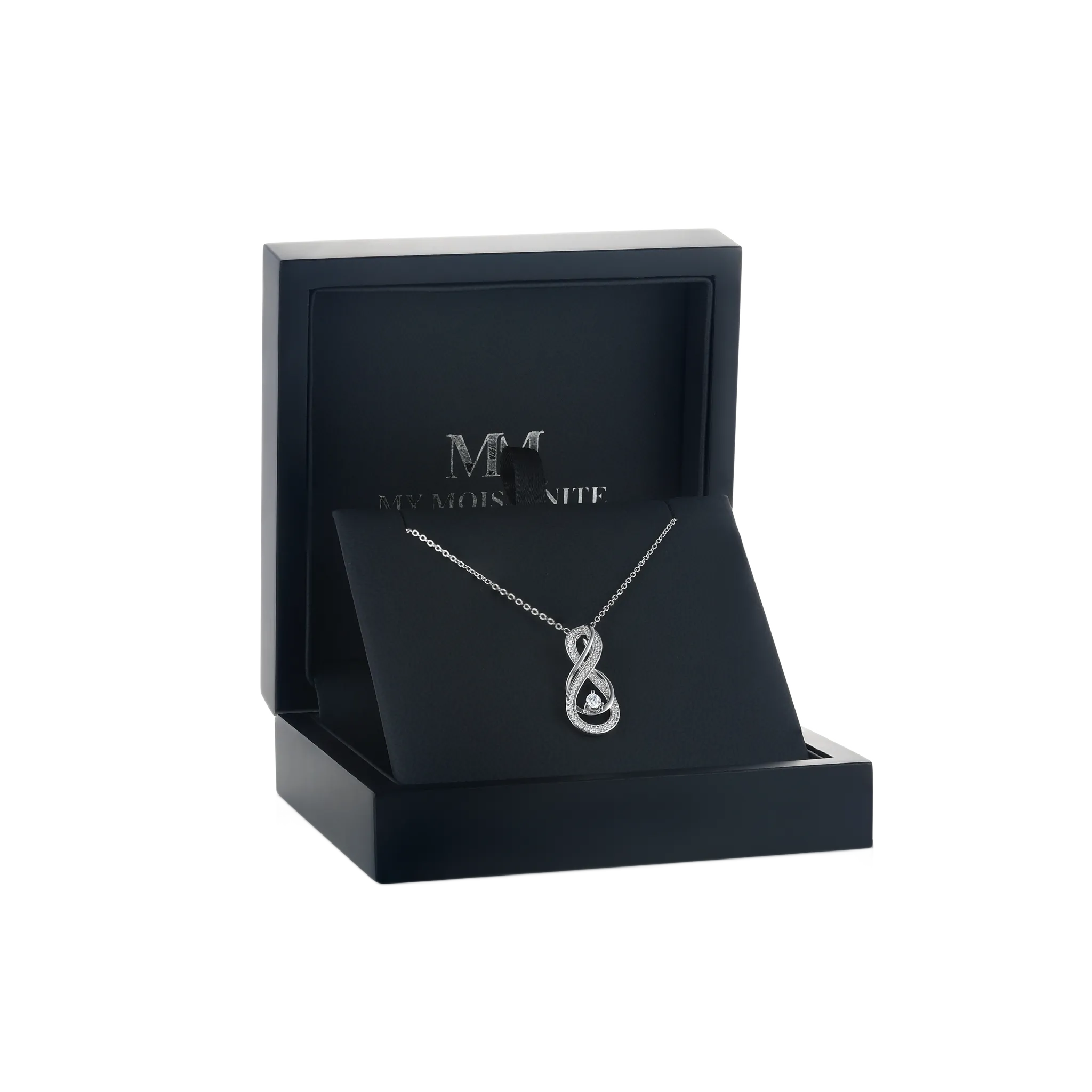 Wisiorek Infinity prezentuje hipnotyzujący design skręcony, symbolizujący wieczną miłość, ozdobiony pojedynczym 3,0mm moissanitem, który wspaniale łapie światło. Inkrustowany 45 precyzyjnie osadzonymi kamieniami 1,0mm, ten wisiorek promieniuje delikatnym blaskiem z każdego kąta. Stworzony dla tych, którzy doceniają urok nieskończonej elegancji, jest fascynującym dodatkiem do każdej kolekcji. Naszyjnik pokazany na zdjęciach jest dołączony, z regulowaną długością 40 cm oraz dodatkowym przedłużeniem o 5 cm.