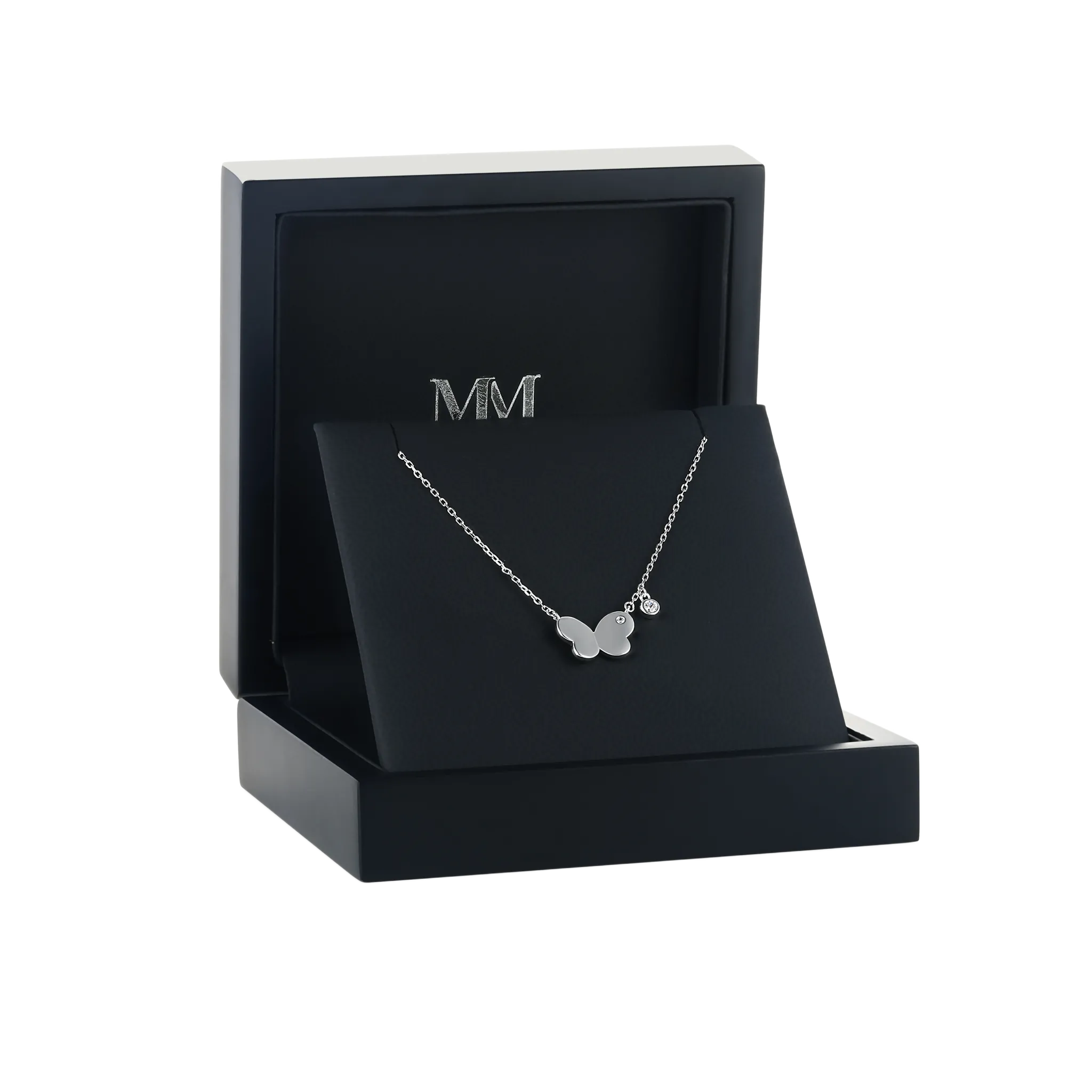 Naszyjnik Papillia to zachwycająca biżuteria, która przyciąga uwagę misternie wykonanym wisiorkiem w kształcie motyla, zgrabnie połączonym z delikatnym łańcuszkiem w splocie ankier. Jego nieodparty urok podkreśla mały, okrągły element ozdobny z pięknie osadzonym moissanitem w eleganckiej oprawie typu bezel, co dodaje całości wyrafinowanego charakteru. Delikatny i kobiecy design czyni go uniwersalnym dodatkiem do każdej kolekcji biżuterii. Idealnie współgrając z naszymi kolczykami Butterfly Beauty, naszyjnik Papillia celebruje prawdziwą elegancję i subtelność.