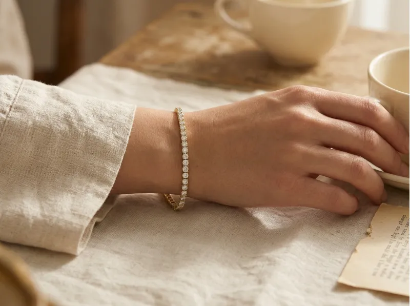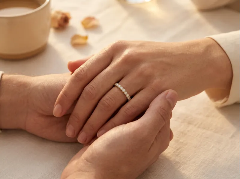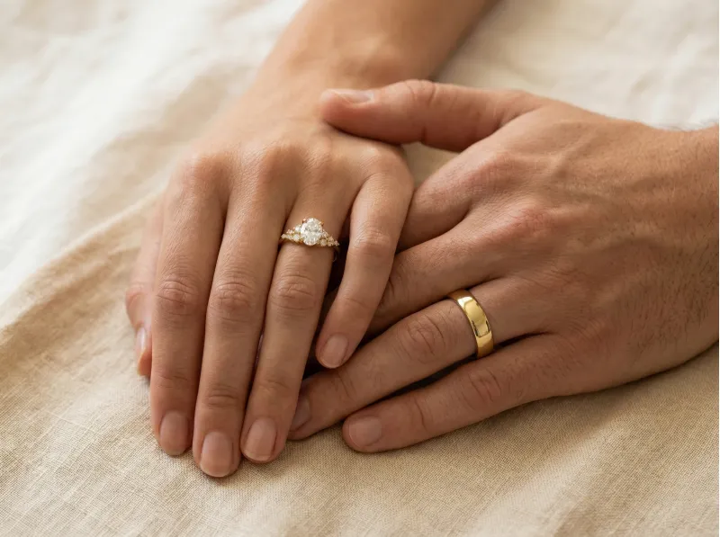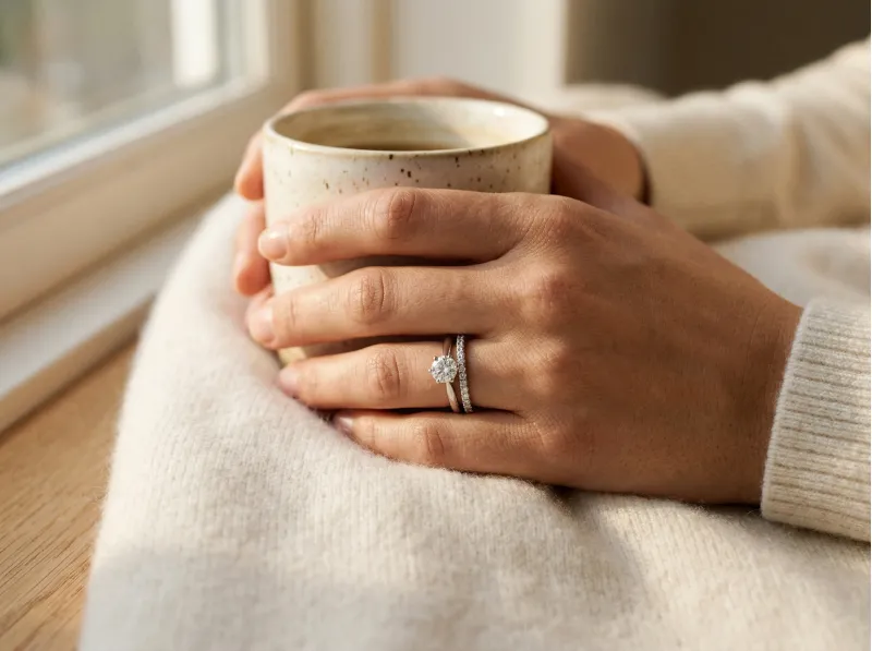 Zestaw Ethereal Elegance łączy pierścionki Ovaline i Serenella, celebrując miłość minimalistycznym, ale uderzającym wzornictwem. Pierścionek Ovaline, z jego delikatnymi kamieniami bocznymi, oferuje elegancki akcent do centralnego moissanitu, podczas gdy obrączka Serenella prezentuje piękną sekwencję kamieni markiza i okrągłych, starannie ułożonych dla urzekającego blasku. Wykonany z cienkiej obrączki o szerokości 1,5 mm, ten zestaw obiecuje lekkość i trwałą atrakcyjność. Otrzymaj 10% zniżki na oba pierścionki z tym wyjątkowym zestawem pierścionków z moissanite.